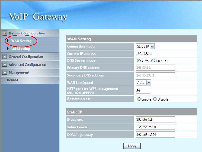 Настройки VoIP шлюза с IP-адресом 192.168.1.1