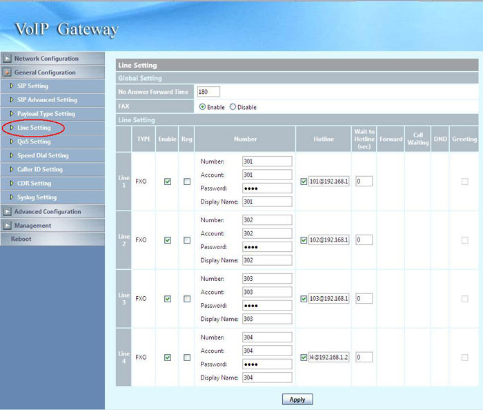4. Установите виртуальные номера линий, например 301-304 , отключите регистрацию и пропишите в Hotline номера и IP адрес FXS на который будут переадресовываться FXO линии при поступлении входящего звонка в формате, например