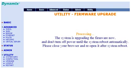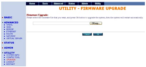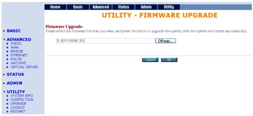 6. Нажав "Обзор" выберите файл прошивки (E5110006.205) из каталога, в который Вы его ранее скопировали Например: d:\E5110006.2025 : Примечание: Файл прошивки мы можете закачать открыв страницу --> http://www.rus.dynamix.ua/support/doc/shdsl/sh4.htm ![]() 7. Нажать клавишу «Ok» 8. Дождаться обновления прошивки (приблизительно 1-2 минуты) ![]() После обновления микропрограммы модем перезагрузится. 9. В меню «UTILITY», выберите пункт «SYSTEM INFO» и проверьте версию микропрограммы для Dynamix UM-S (строка таблицы "Software Version"). Она должна быть 205 или 206. Ваш Dynamix UM-S готов к работе! |