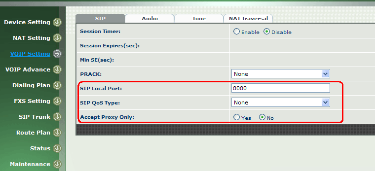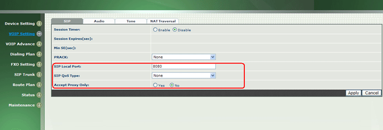 4. Настройки VoIP шлюза FXS-04. 4.1. Установить настройки VoIP Setting ->SIP SIP Local Port: 8080, Accept Proxy Only: No