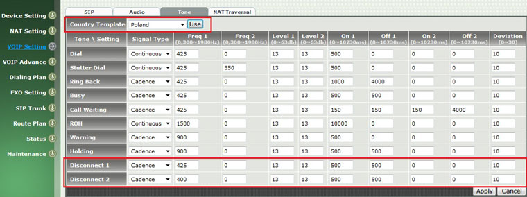 3.5. Для правильного определения сигнала «занято» при подключении FXO портов к телефонной линии следует в настройках VoIP Setting -> Tone установить страну. Для городских АТС выбрать страну Poland , нажать “Use” и “Apply”, для офисных АТС предпочтительнее выбрать страну United States.
