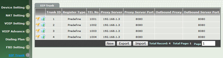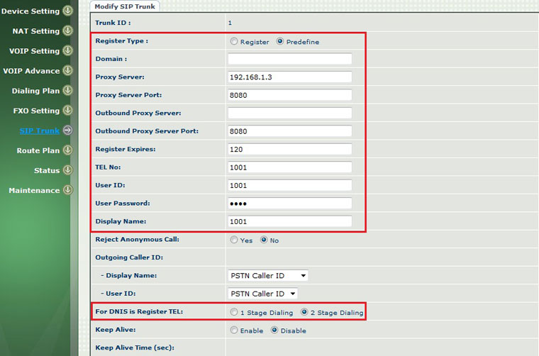 Caller ID установить ETSI DTMF. 3.2. Настроить SIP транки в меню SIP Trunk. Например именуем транки как 1001-1004 .