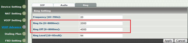 3.4 Проверить настройки входящих звонков Ring Cadence в пункте меню VoIP Advance -> Ring.