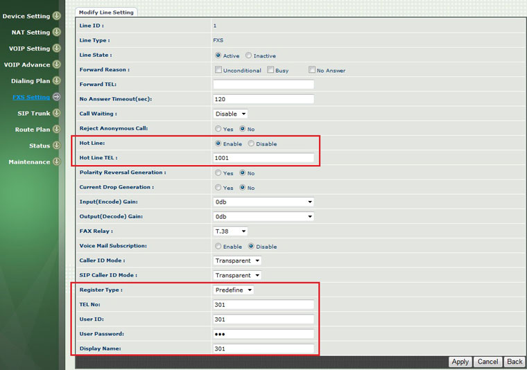 4.2. Установить линии FXS как в нашем примере 301-304. Для этого зайдите в пункт меню