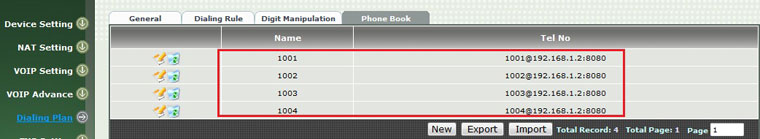 4.4. Настроить Dialing Plan -> Phone Book, записать соответственно номер транка FXO, IP адрес 192.168.1.2 и порт 8080 как на рисунке снизу. Для первой записи 1001 будет выглядеть как: 1001@192.168.1.2:8080