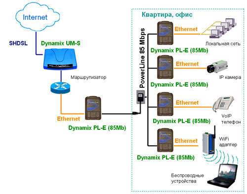 новый мост Ethernet - Powerline применяется для подключения (объединения) любых Ethernet устройств к (в) локальной сети посредством электрической сети.