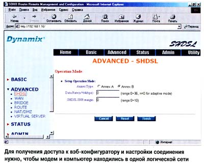 Подключим модемы к ПК прилагаемым интерфейсным кабелем RS-232 и первому модему, предназначенному для эксплуатации в режиме моста, назначим IP-адрес нашей сети, по которому потом сможем воспользоваться его вэб-интерфейсом. Скажем, это будет 192.168.1.100. Сетевую маску примем, как и для всей нашей сети, 255.255.255.0. Манипулируя меню, переведем модем в режим моста и перейдем к настройке WAN-интерфейса, то есть непосредственно DSL-соединения. Определимся, какой из модемов будет ведущим, а какой -