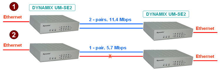 DYNAMIX UM-SE - серия сетевых удлинителей, функционирующих в соответствии с новым стандартом IEEE 802.3ah “Ethernet in the First Mile” (EFM). Они позволяют обеспечить гибкое и эффективное решение по скоростной передаче Ethernet трафика в режиме “точка-точка” по медным парам проводов. DYNAMIX UM-SE обеспечивают симметричную полосу передачи данных до 22.8 Mbps при использовании четырех пар проводов, 11,4 Mbps при использовании двух пар и 5,7 - одной пары. Базирующийся на стандартной EFM (2BASE-TL) технологии, сетевые удлинители серии DYNAMIX UM-SE могут быть быстро развернуты на уже существующей медной проводке и позволяют экономически эффективно предоставлять высокоскоростные Ethernet услуги. |