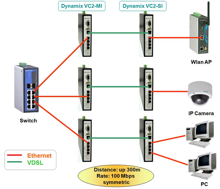 - простые в установке индустриальные устройства с максимальной симметричной скоростью до 100 Mbp по существующей телефонной линии. VDSL2 модемы - маршрутизаторы Dynamix VC2-MI (ведущий - master) и Dynamix