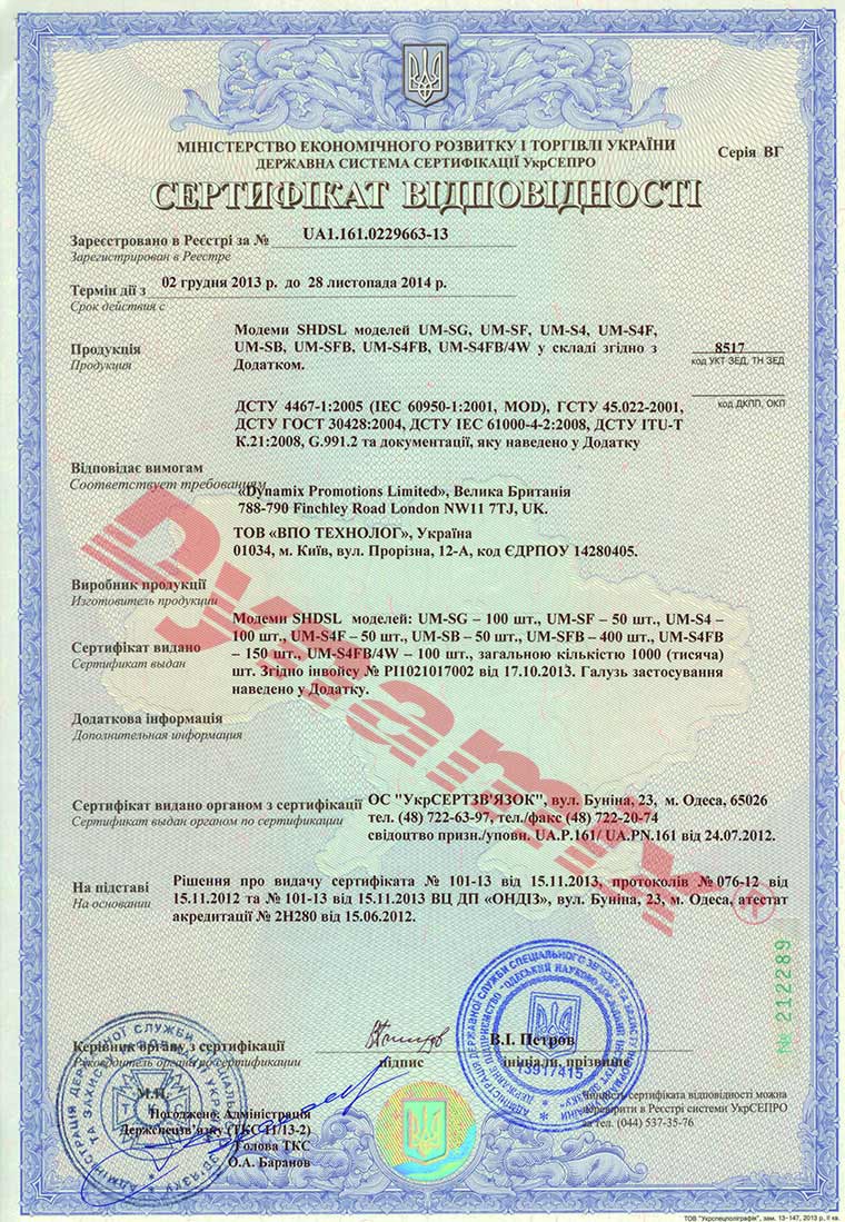 Сертификат соответствия на SHDSL модемы / маршрутизаторы семейства Dynamix UM-S в Украине