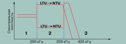 одинаковы. Во втором диапазоне частот (200-250 кГц), спектральная плотность сигнала от LTU (оборудования на узле связи) к NTU (абонентскому оборудованию) уменьшена, чтобы снизить его влияние на сигнал в обратном направлении в этой области