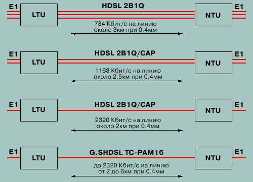 Аналогичная картина складывалась в это время и в Европе - получили распространение варианты HDSL, которые обеспечивают передачу потока Е1 ETSI (2048 Кбит/с). Сначала появился вариант, который для получения большей скорости при